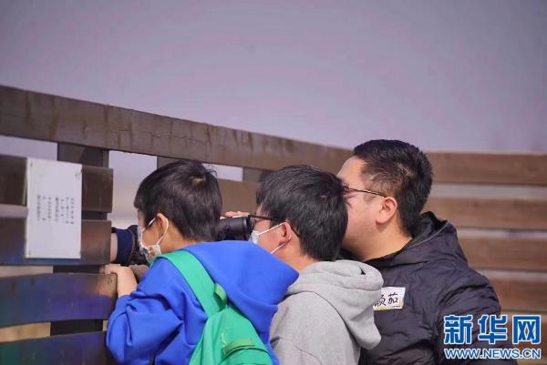 游客在观鸟平台通过望远镜观察候鸟。新华网发 舒雯 摄