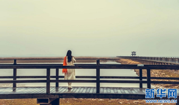 游客在吴城依湖而建的观鸟栈道拍照打卡。新华网发