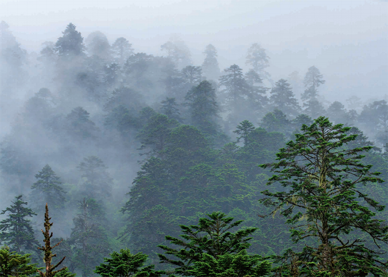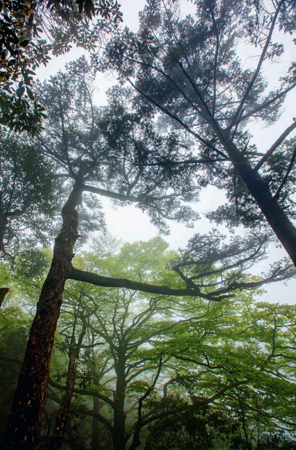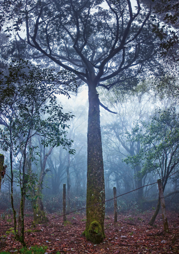 树体并不太高,斑驳龟裂的树皮上附生着苔藓和地衣,相比周围其他树的暗褐色更为醒目。松柏类的裸子植物大多树干笔直而分枝弱,百山祖冷杉却有如伞一样的树冠,几条粗大的树枝横岔出去,细条形的叶在小枝上密密排着。浓雾中暗色的枝叶,闪烁着叶尖的水滴和叶背气孔带银色的光。它们的周围是两道细细的铁丝围栏,在掏出相机之前,我摸索着在铁围栏边静静看了一会儿。我曾看过北极圈连绵的泰加林和白桦林,看过世界上最大和最高的巨杉与北美红杉,看过存活很可能超过数万年的北美颤杨林,数千年的刺果松和银杏,站在婆罗洲雨林里的黄娑罗双巨大的板根下,却从未像那一刻一样贪婪地端详着,仿佛我看的每一眼都是最后一眼。