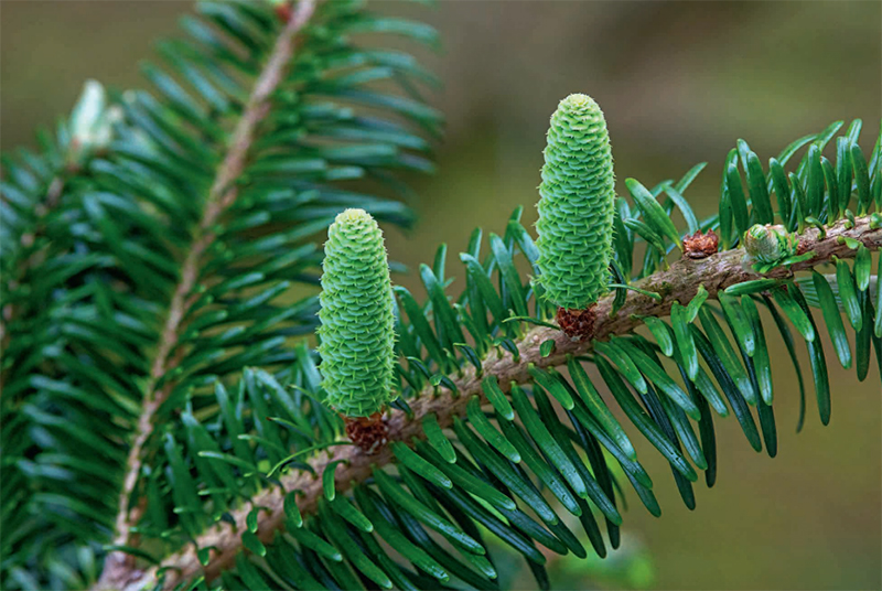 百山祖冷杉雌球花向上、雄球花向下,花期正值雨季,不利于花粉传播,很难长出有效种子,自我繁殖十分困难。要培育实生苗,只有等到雌雄球果同时开花结果才有机会。直到 1991 年,3株冷杉中的雌、雄两株冷杉终于同时开花。(钟鑫摄)