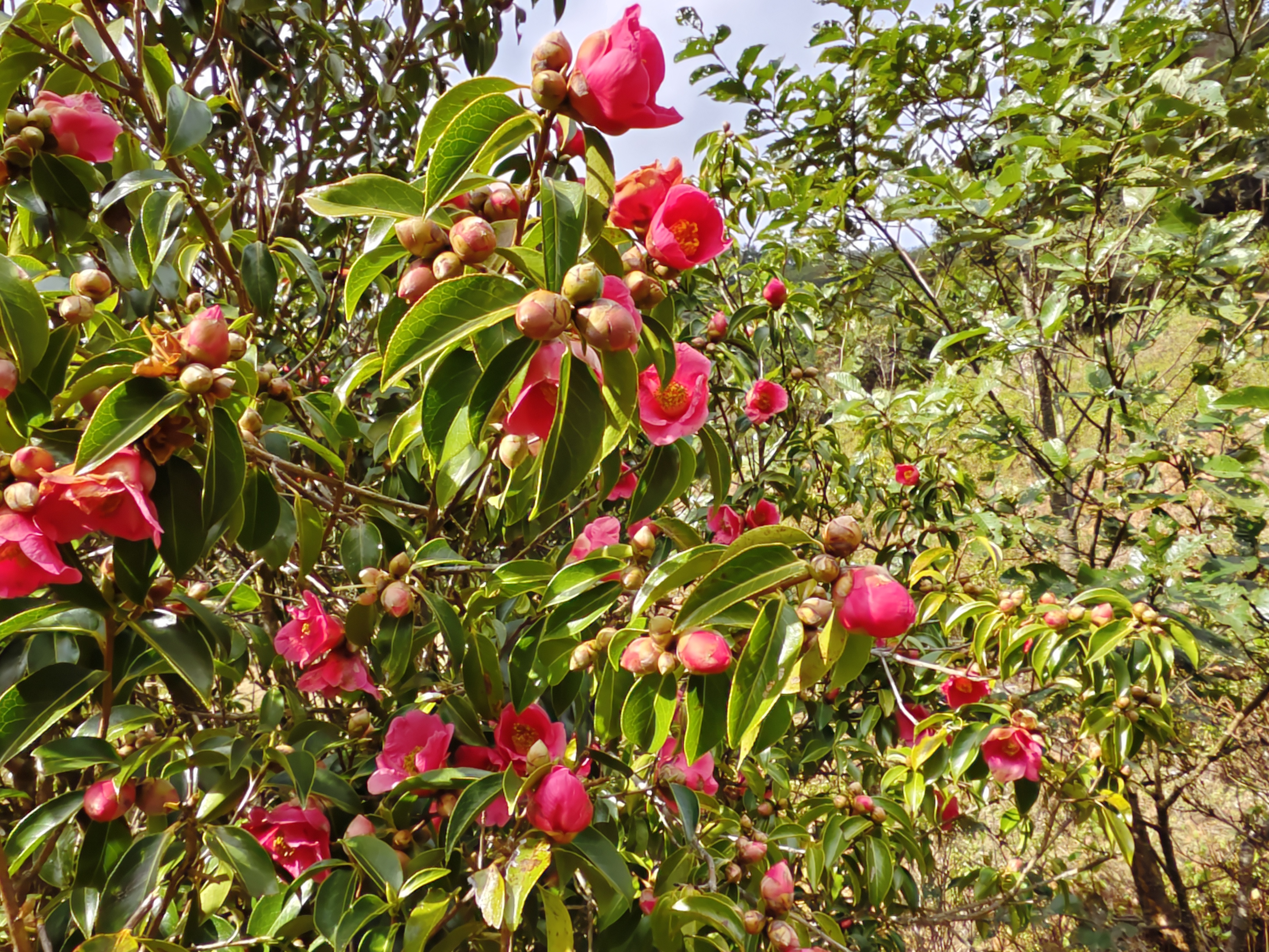 红花油茶集经济价值与观赏价值于一体,昌宁县作为云南特有的红花油茶的重要种质资源地,采取多种措施对野生红花油茶资源进行管护。红花油茶花色多样,花期较长,一般于当年10月孕育花苞,11月次第开放,直至来年4月花期才结束。与往年相比,今年昌宁县的红花油茶花期普遍提前,花也开得十分茂盛。